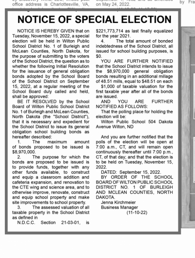 Representatives of Wilton Public School contacted the Leader-News advertising department requesting an urgent placement of an election notice, which state law mandates be published a minimum of two weeks before the election. The notice was first published six days ahead of the election.