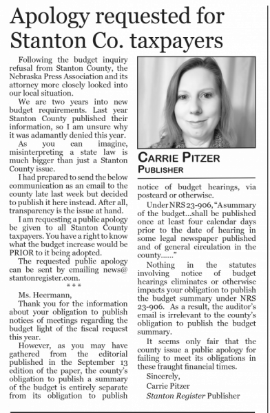 It wasn’t until a FOI request that the county sent the entire document to the newspaper, which we published in its entirety as a public service to our readers. Our publisher also printed an editorial pointing out the lack of transparency. Per the Nebraska Press Association’s attorney, we published an additional letter requesting a public apology to stakeholders be put in the newspaper.