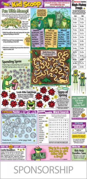 Learning math skills can be challenging for children. Frogs make it fun! Show this lively Kid Scoop financial literacy page to retailers and organizations that are preparing for spring now! They are ideal sponsors, bringing in new revenue.