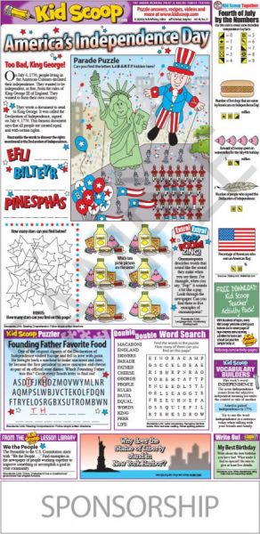 Show this page to local retailers who sell Fourth of July bunting, flags, and picnic food — they are ideal sponsors for this important patriotic celebration. You’ll connect these sponsors to educational activities all family members can enjoy. Learning doesn’t need to stop during the summer school break. The Kid Scoop weekly page entices youngsters to continue practicing reading and math skills, plus learn more about key historical events.