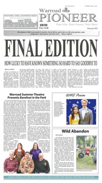 Collins’ declaration came in a follow–up to MPR reporter John Engler's report on the May 7 demise of the Warroad Pioneer, one of three weeklies in Roseau County, on Minnesota's northern border. Engler paraphrased New York Times reporter Richard Fausset: “He said he spent a week in Warroad, talking to locals about the paper closing. He admitted that most folks, outside of the Pioneer staff and their husbands, didn't seem too broken up about it.”
