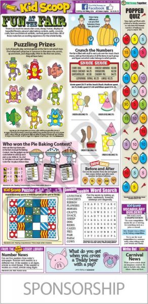 Whether it’s a ride on the Ferris Wheel or showing off that cow you’ve raised, summer fairs attract increased shoppers to your town. Newspapers often produce special sections highlighting food, crafts, and games for prizes at the fair. Kid Scoop contributes this special “Fun at the Fair” page that includes festive math puzzles all related to a good time at the fair using your newspaper.