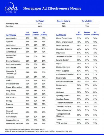 The news is even better for circulars/preprints where reader recall jumps to 66%, with 71% of those readers motivated to act. Coda Ventures' data are based on more than 700,000 issue-specific surveys measuring more than 6,000 ads across 40 newspapers around the United States from January 2016 to May 2020. “It is NOT a small sample survey!” Carol added.