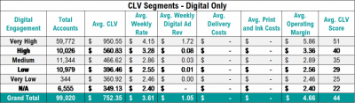 The final table has CLV for digital-only subscribers. They have an average weekly rate of $3.61, and an average operating margin of $4.66 including digital advertising revenue, which was also included in the print plus digital products too. They average five-year CLV for this segment is $752.35.