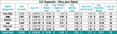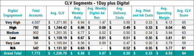 The variation in CLV for digital only subscribers across engagement levels is noteworthy. The most engaged digital only subscribers have CLV scores that are almost three times greater than the lowest segment. The reasons are average rates, with highly engaged digital subscribers paying much more than less engaged readers, digital advertising revenue and higher retention.