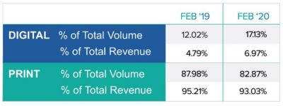 A table demonstrating the strategic importance of a transition plan for migrating audience revenue across platforms is below. In February of 2019, digital subscriptions were 12% of the total, but they were only 4.8% of the revenue. In February of 2020, digital subscriptions had moved to 17% of total volume and 7% of revenue.