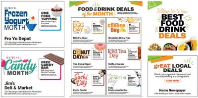 - Food & Drink Deals of the Month: Page Layout + Print & Web Ad Templates + Heading Designs + Social Media Promotions + Marketing Support