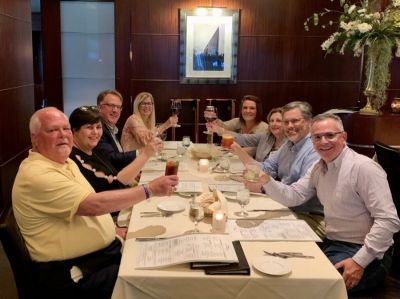 Newspaper Association Managers (NAM) toast longtime postal consultant Max Heath as they meet in Madison, Wisconsin, for their annual meeting. Clockwise from front left: David Thompson, Kentucky Press Association; Teresa Thompson and Dave Bordewyk, South Dakota Newspaper Association; Lynne Lance, National Newspaper Association; Monica Gilmore, Mississippi Press Association; Felicia Mason, Alabama Press Association; Layne Bruce, Mississippi Press Association; Jim Fogler, Florida Press Association.