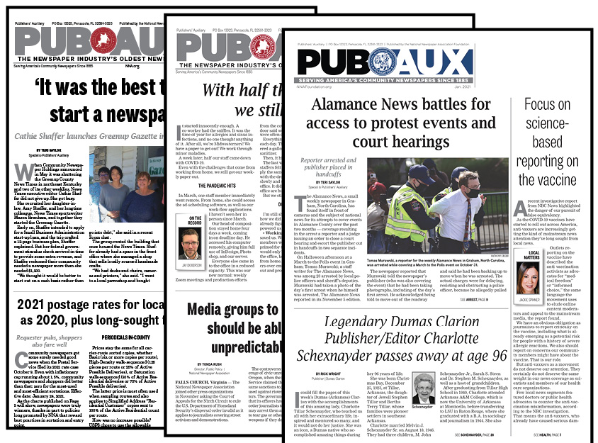 Publishers' Auxiliary (Pub Aux) is the only national publication serving America's community newspapers. (Print ISSN 0048-5942 | Online ISSN: 2833-8065)
