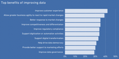 93% of those surveyed said data quality will be fundamental to operations moving forward, with 40% saying they are investing in automation of data quality rules and processes. Hiring and developing business users’ data skills was also a top investment for data-minded leaders, with the top expected benefits of quality data being improved customer experience (for 42%) and greater agility to react to rapid market changes (39%).