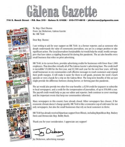 I wrote a letter on behalf of our newspaper to the U.S. representative, as well. The more diverse voices advocating for this, the better the chance of it passing. For a solid draft letter, visit https://www.nna.org/issue-brief-local-journalism-sustainability-act-hr-7640 and take some direction from the piece Tonda put together. Personalize that; make it your own. Show legislators how HR 7640 stands to benefit small businesses.