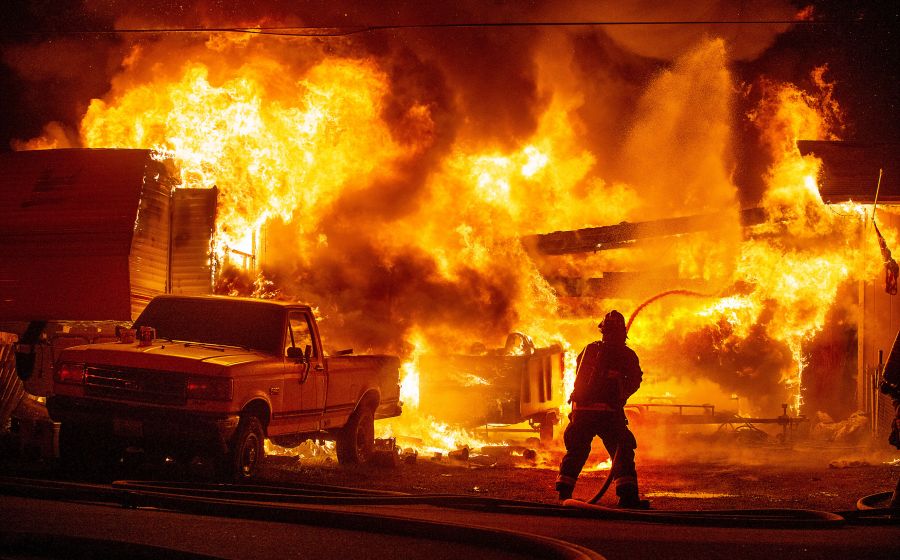 News: Firefighters lay down hoses along Highway 97A Friday afternoon, July 15, 2022, as smoke and fire come from Keyes Fibre’s manufacturing plant in the background. Chelan County Fire Department was hoping to contain the fire to two of seven areas inside the building. (Don Seabrook | The Wenatchee (Washington) World)