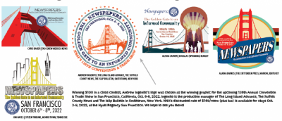 Winning $100 in a close contest, Andrew Ingenito's logo was chosen as the winning graphic for the upcoming 136th Annual Convention & Trade Show in San Francisco, California, Oct. 6-8, 2022. Ingenito is the production manager of The Long Island Advance, The Suffolk County News and The Islip Bulletin in Patchogue, New York. NNA's discounted rate of $169/room (plus tax) is available for stays Oct. 3-9, 2022, at the Hyatt Regency San Francisco. We hope to see you there!